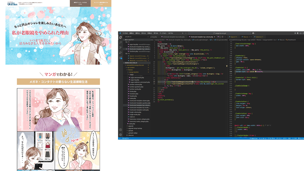 制作したマンガ、イラスト一式と、LPのコーディングファイル(HTML+CSS+JavaScript+画像ファイル)が含まれます。