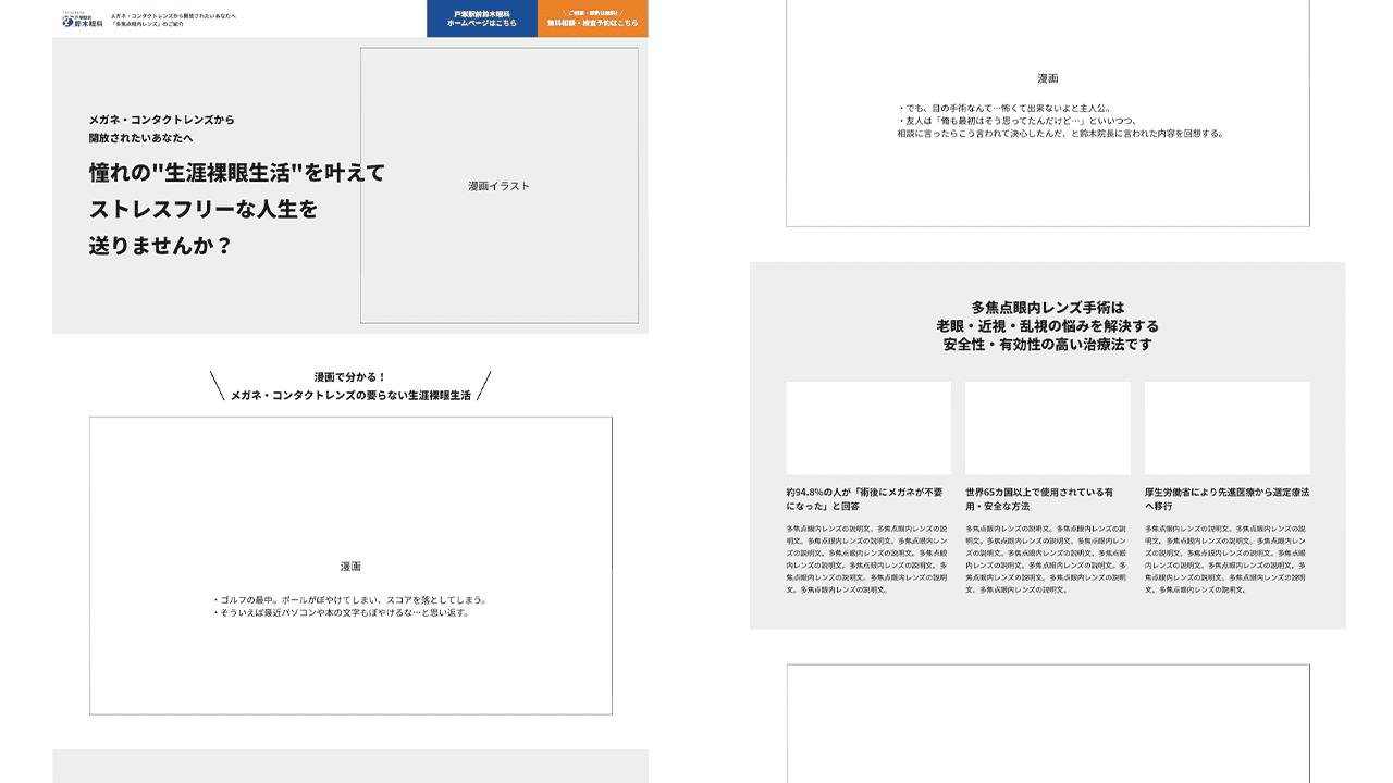 まるっとマンガLP制作をご依頼いただく場合は、訴求する内容をヒアリングさせていただき、LP全体の構成を企画し、ワイヤーフレームとして提案いたします。マンガだけではなく、LP全体の流れを確認いただけるので、制作がスムーズになります。