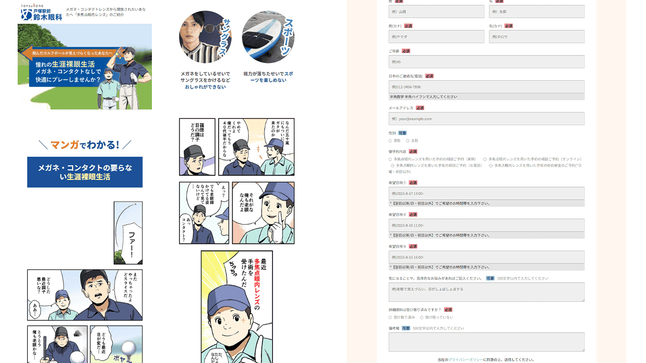 マンガLPは、漫画ならではの「続きを読みたい」という特性を活かしたコンテンツです。ファーストビューから、各セクションの間などにマンガを入れ込むことで、ユーザーの興味を引きつつ、内容を分かりやすく伝えることができます。